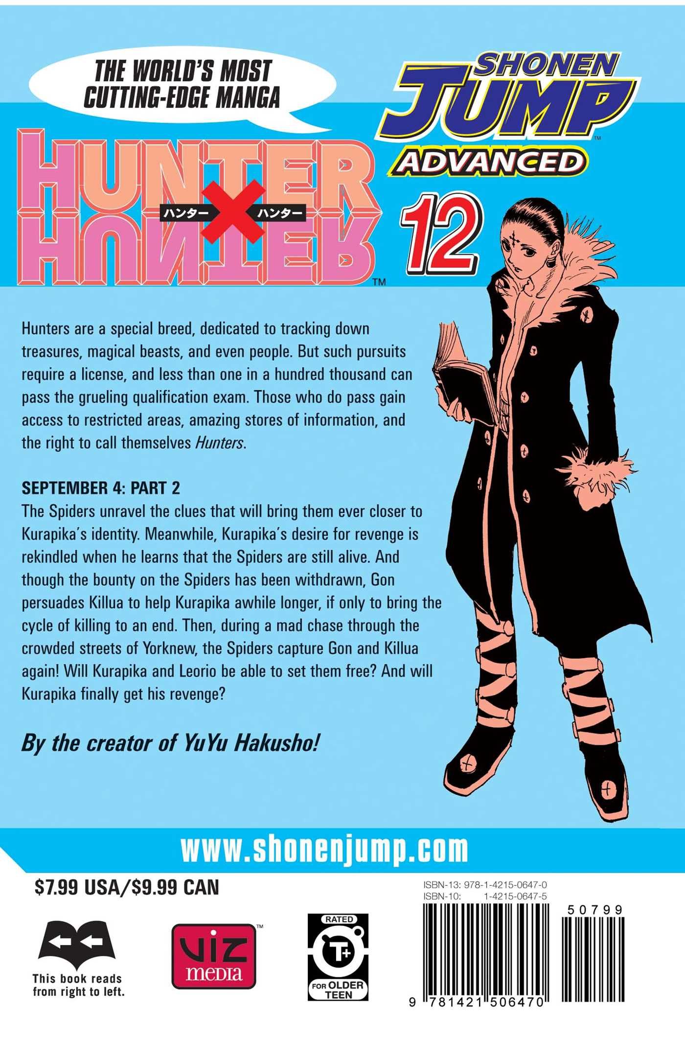 The Spiders unravel the clues that will bring them ever closer to Kurapika's identity. Meanwhile, Kurapika's desire for revenge is rekindled when he learns that the Spiders are still alive. And though the bounty on the Spiders has been withdrawn, Gon persuades Killua to help Kurapika awhile longer, if only to bring the cycle of killing to an end. Then, during a mad chase through the crowded streets of Yorknew, the Spiders capture Gon and Killua again! Will Kurapika and Leorio be able to set them free? And will Kurapika finally get his revenge?