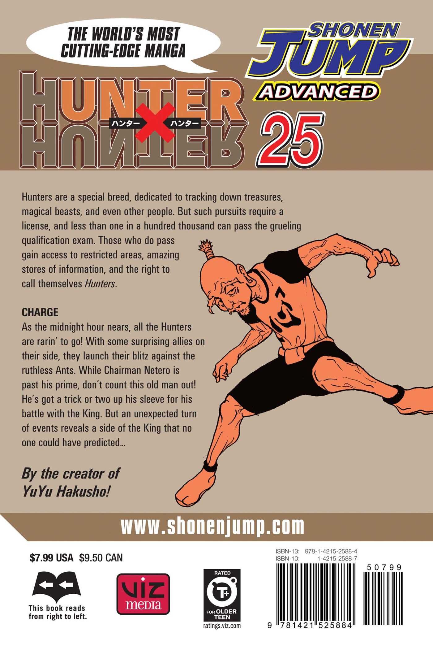 As the midnight hour nears, all the Hunters are rarin' to go! With some surprising allies on their side, they launch their blitz against the ruthless Ants. While Chairman Netero is past his prime, don't count this old man out! He's got a trick or two up his sleeve for his battle with the King. But an unexpected turn of events reveals a side of the King that no one could have predicted...