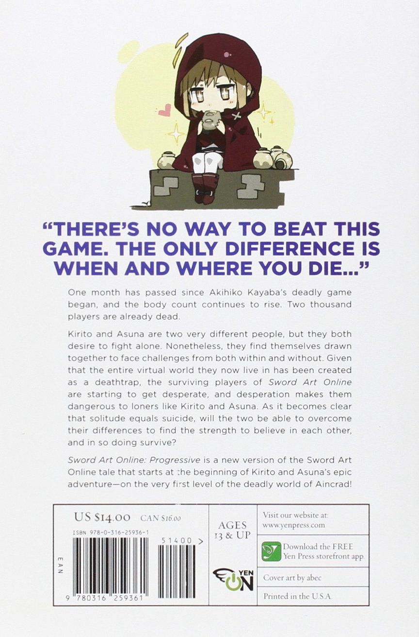 'There's no way to beat this game. The only difference is when and where you die...'One month has passed since Akihiko Kayaba's deadly game began, and the body count continues to rise. Two thousand players are already dead. Kirito and Asuna are two very different people, but they both desire to fight alone. Nonetheless, they find themselves drawn together to face challenges from both within and without. Given that the entire virtual world they now live in has been created as a deathtrap, the surviving players of Sword Art Online are starting to get desperate, and desperation makes them dangerous to loners like Kirito and Asuna. As it becomes clear that solitude equals suicide, will the two be able to overcome their differences to find the strength to believe in each other, and in so doing survive?Sword Art Online: Progressive is a new version of the Sword Art Online tale that starts at the beginning of Kirito and Asuna's epic adventure--on the very first level of the deadly world of Aincrad!