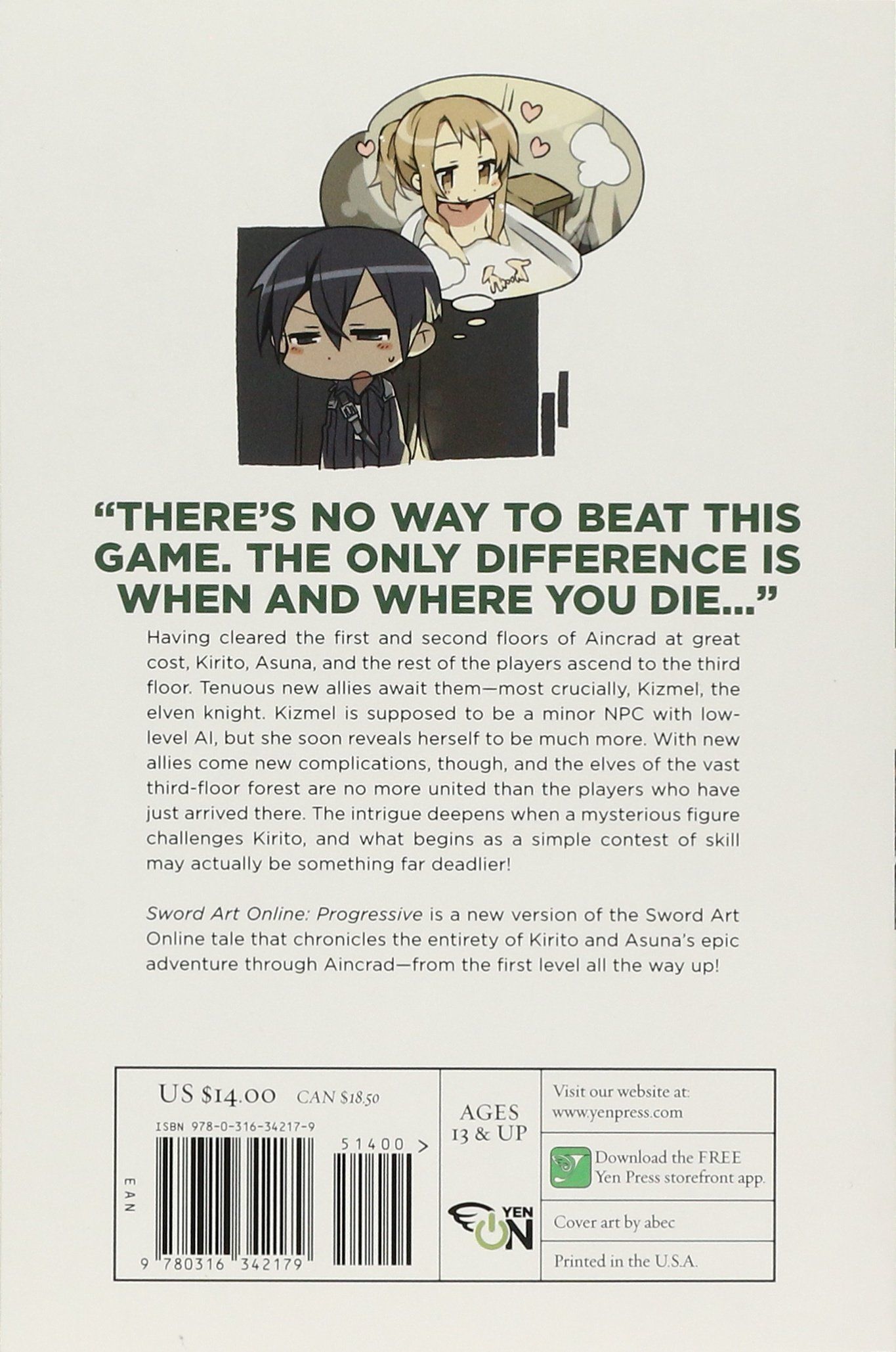 'There's no way to beat this game. The only difference is when and where you die...'Having cleared the first and second floors of Aincrad at great cost, Kirito, Asuna, and the rest of the players ascend to the third floor. Tenuous new allies await them--most crucially, Kizmel, the elven knight. Kizmel is supposed to be a minor NPC with low-level AI, but she soon reveals herself to be much more. With new allies come new complications, though, and the elves of the vast third-floor forest are no more united than the players who have just arrived there. The intrigue deepens when a mysterious figure challenges Kirito, and what begins as a simple contest of skill may actually be something far deadlier! Sword Art Online: Progressive is a new version of the Sword Art Online tale that chronicles the entirety of Kirito and Asuna's epic adventure through Aincrad--from the first level all the way up!