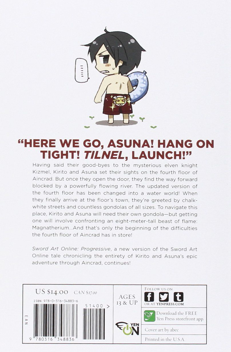 Having said their good-byes to the mysterious elven knight Kizmel, Kirito and Asuna set their sights on the fourth floor of Aincrad. But once they open the door, they find the way forward blocked by a powerfully flowing river. The updated version of the fourth floor has been changed into a water world! When they finally arrive at the floor's town, they're greeted by chalk-white streets and countless gondolas of all sizes. To navigate this place, Kirito and Asuna will need their own gondola--but getting one will involve confronting an eight-meter-tall beast of flame: Magnaterium...And that's only the beginning of the difficulties the fourth floor of Aincrad has in store!