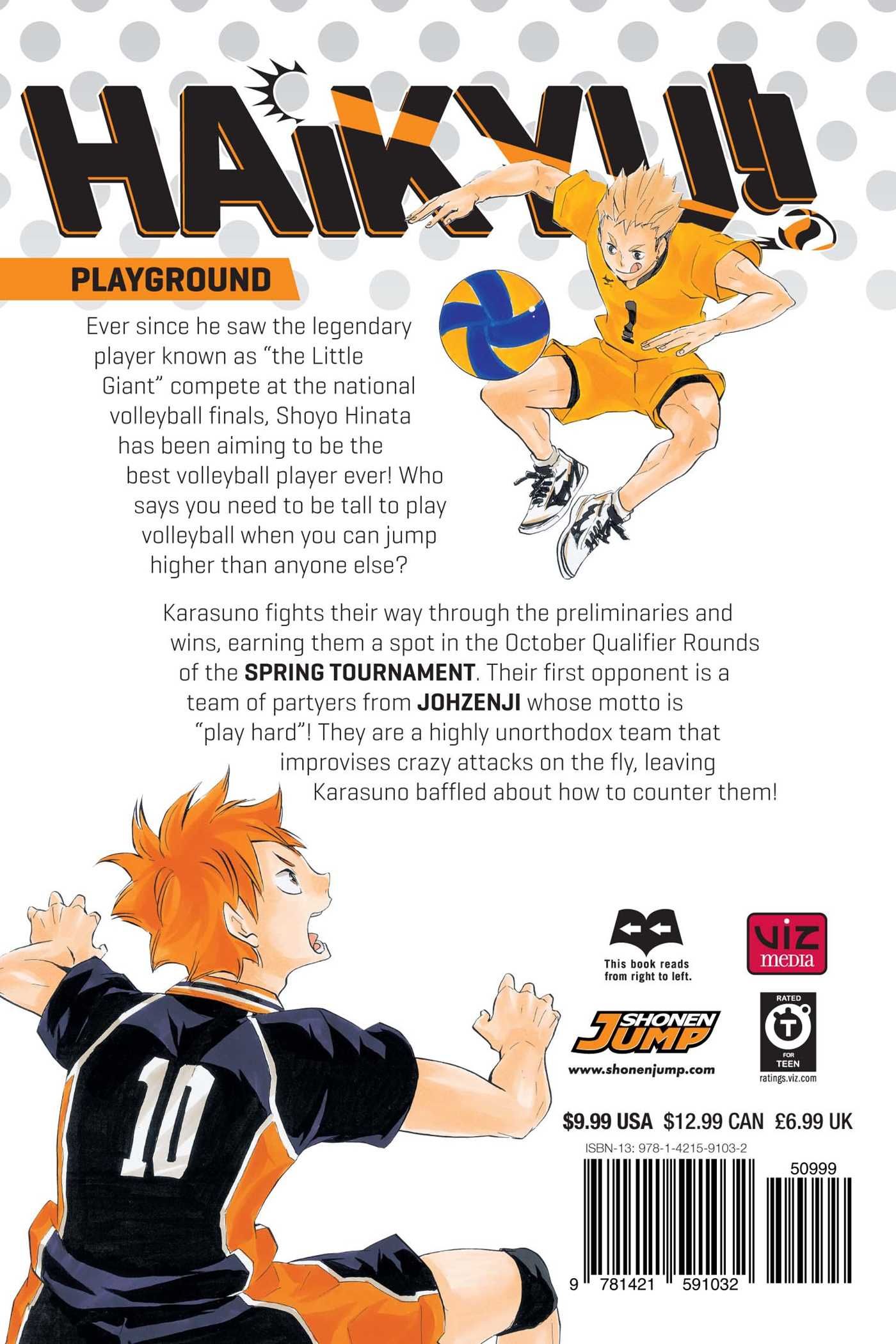 Ever since he saw the legendary player known as "the Little Giant" compete at the national volleyball finals, Shoyo Hinata has been aiming to be the best volleyball player ever! He decides to join the team at the high school the Little Giant went to and then surpass him. Who says you need to be tall to play volleyball when you can jump higher than anyone else? Thanks to their practice games with Tokyo’s powerhouse teams, Karasuno now has a whole new arsenal of weapons at their disposal. Hinata and Kageyama’s new quick set is also starting to come together! When the Spring Tournament preliminaries begin, Karasuno has high hopes of turning all their past frustrations and losses into victories!